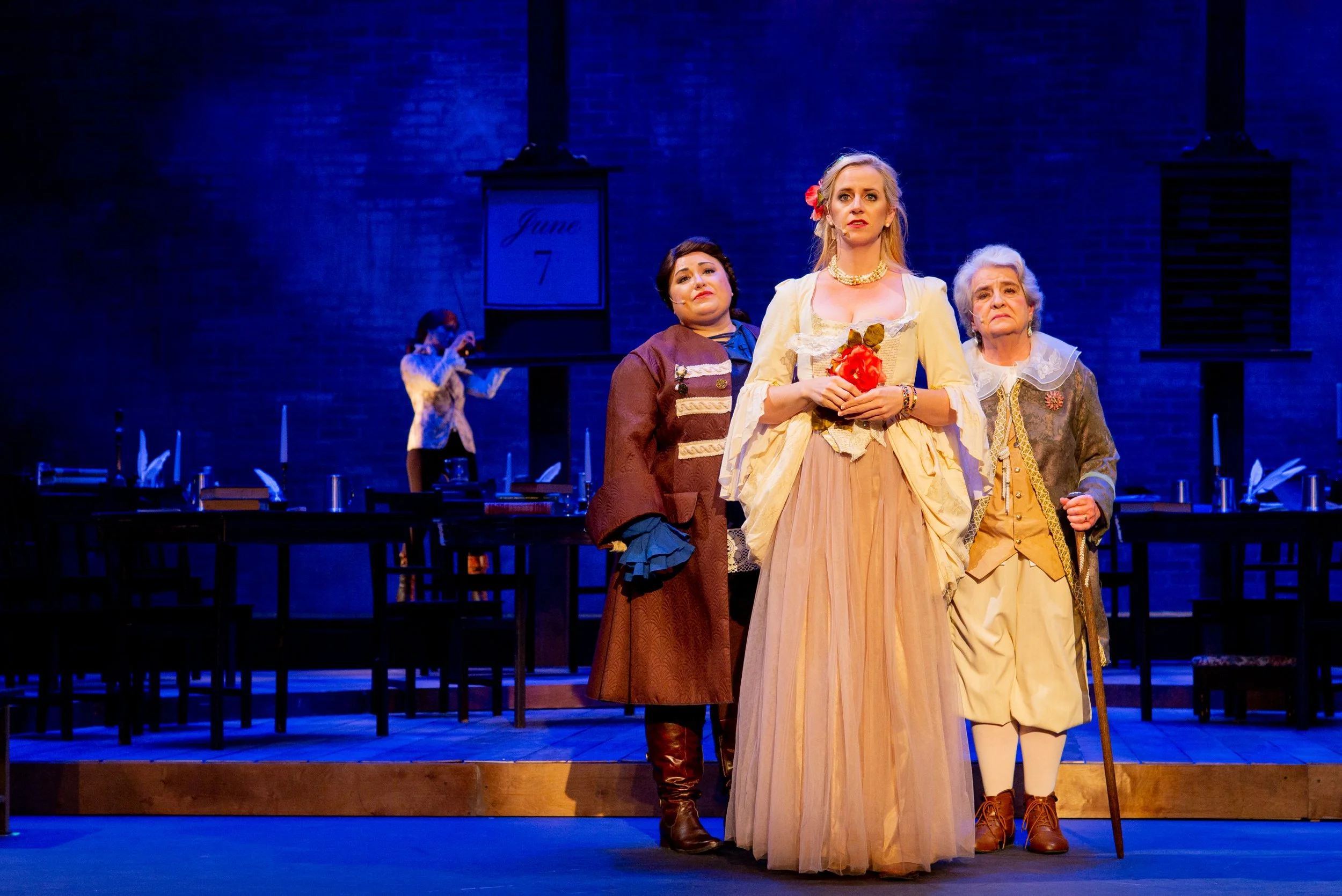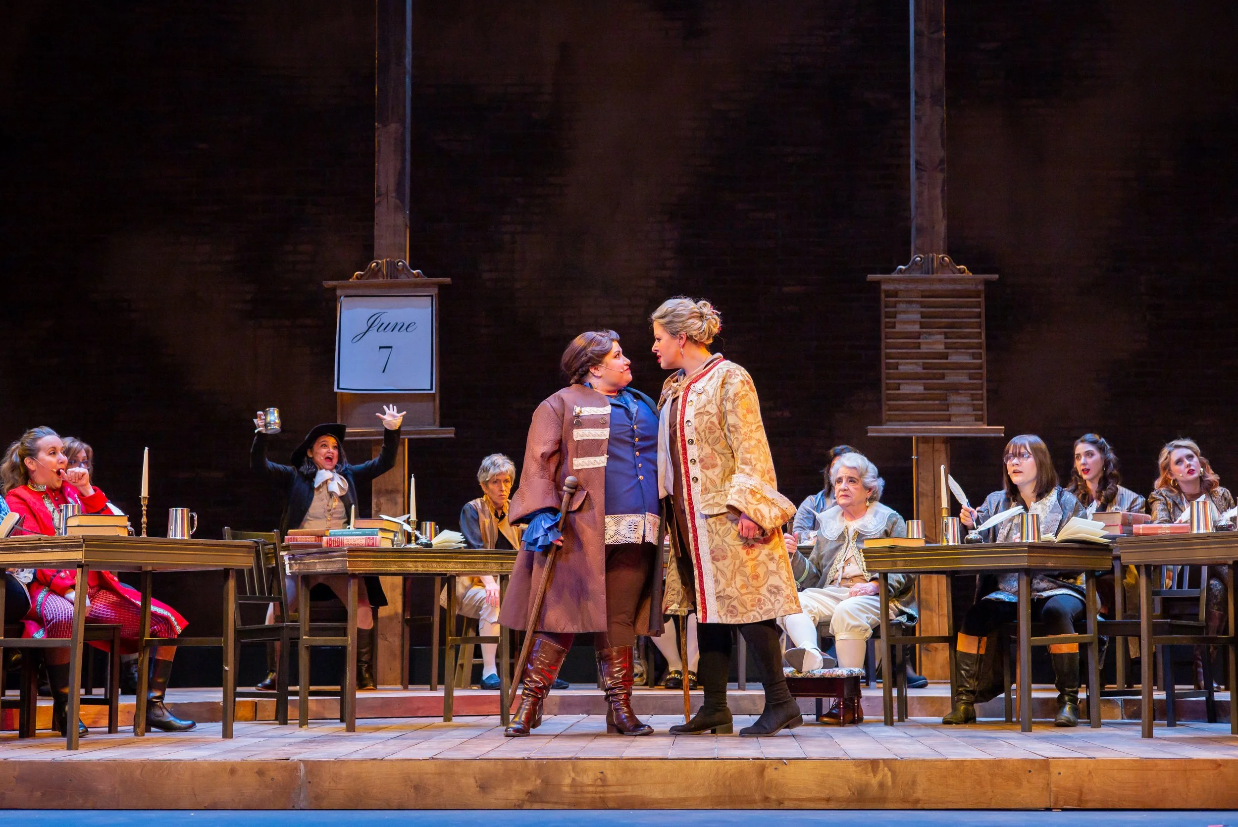 In my production of 1776, I wanted my cast of women and non-binary actors not to play men but the people of power who shaped our nation at its birth, ignoring their gender. I felt that making them step into a role and having them portray a man would restrict their creativity and hurt their performances. In our one-on-one character development sessions, I chatted with each actor about their delegate and explored the masculine and feminine energies each of them possessed. This allowed the actors to make choices that were truthful for them. Having these founding fathers portrayed by women stripped the characters of their gender and gave the audience the opportunity to experience these figures in a totally new way, as if they were meeting them for the first time, while still telling the story of the American Revolution.